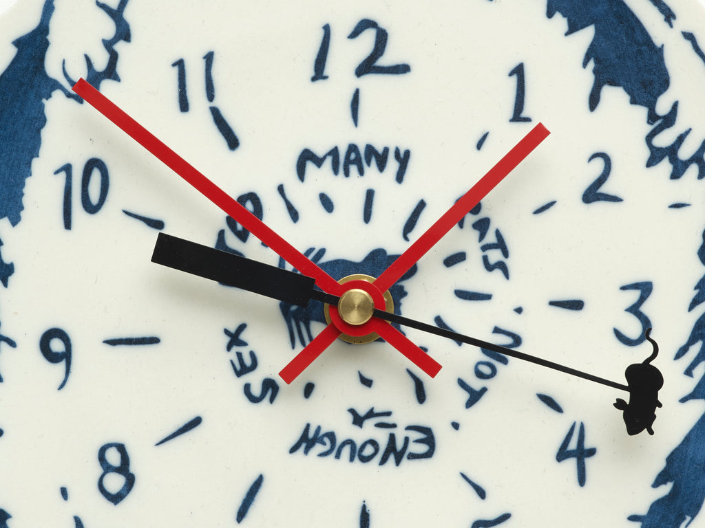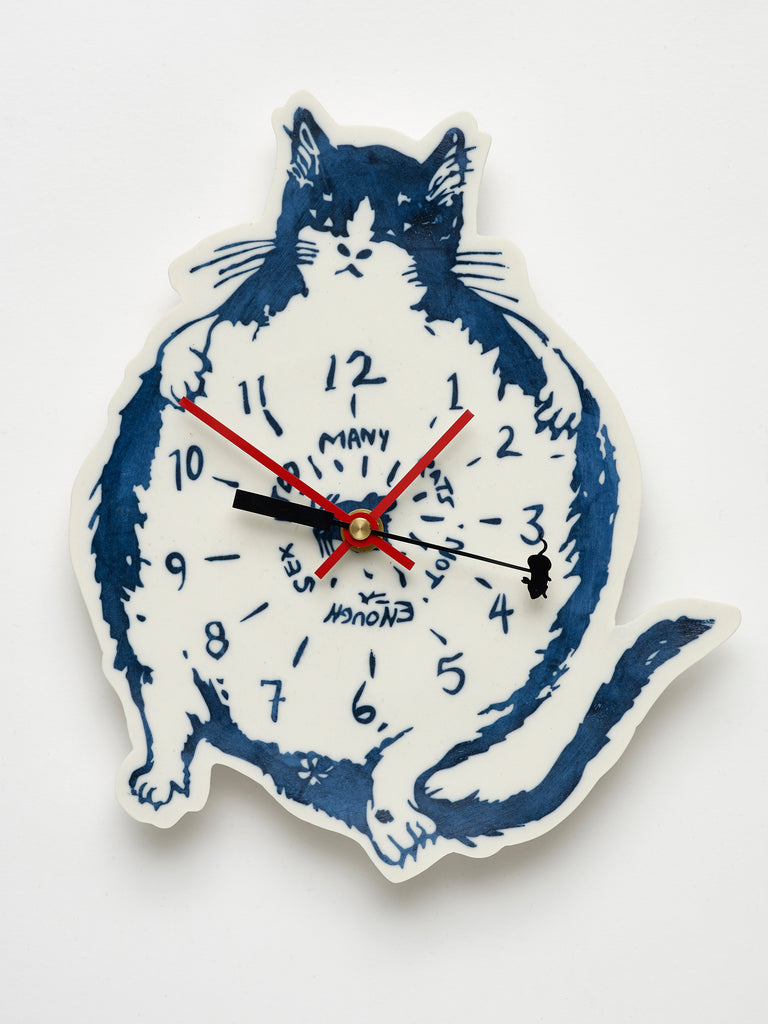 Too Many Rats, Not Enough Sex, (2025) connects to a series of thin porcelain clocks that the artist has been making since 2022. The form of the cat builds on her recurring interest in interspecies relationships. For this clock, Lin chose her own cat Roger as her subject matter. Besides personally liking cats, Lin thinks of them as independent and wilful creatures with a rebellious and unpredictable spirit.